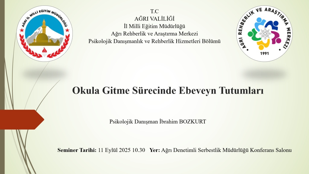 11 Eylül 2025 Perşembe günü saat 10.30 ‘da Ağrı Denetimli Serbestlik Müdürlüğü Konferans Salonunda Denetimli Serbestlik Kapsamından yararlanan bireylere yönelik kurumumuz psikolojik danışmanı İbrahim BOZKURT tarafından ‘’Okula Gitme Sürecinde Ebeveyn Tutumları’’ konulu seminer düzenlenmiştir. İlgili davetleri için teşekkür ederiz.